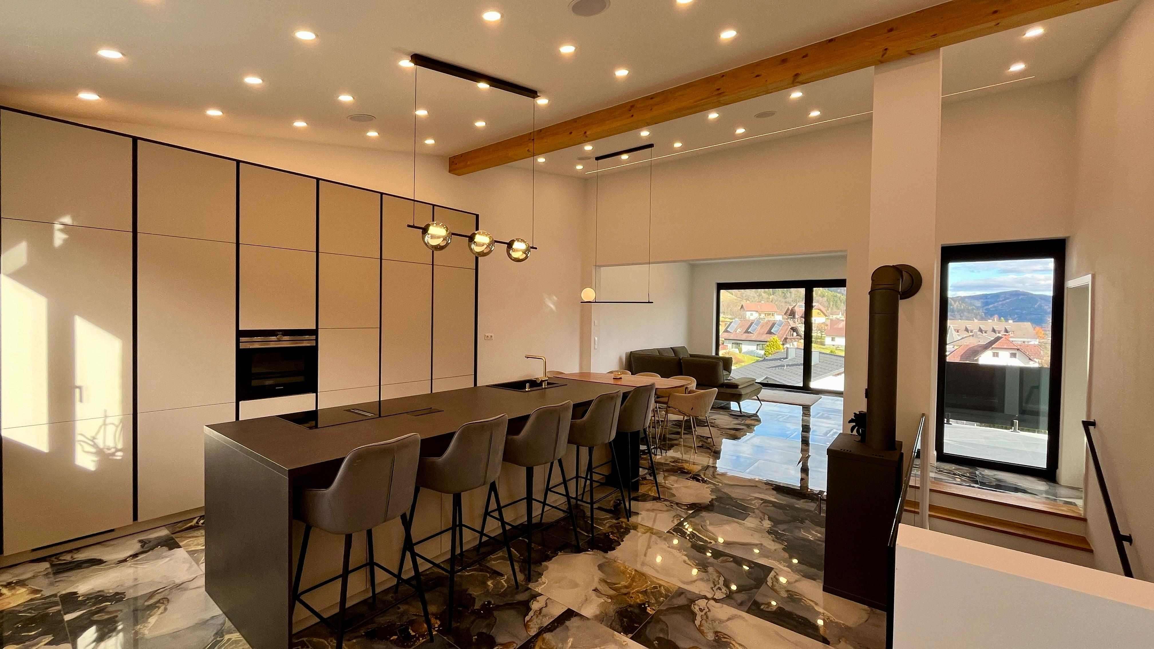 Das Herzstück des Hauses bildet die exklusive Wohnküche mit stilvoller Kochinsel, die fließend in den offen gestalteten Wohn-und Essbereich übergeht. Dieses architektonisch gelungene Raumkonzept verbindet Kochen, Essen und Wohnen auf eine elegante Weise und schafft ein Zentrum für die ganze Familie.